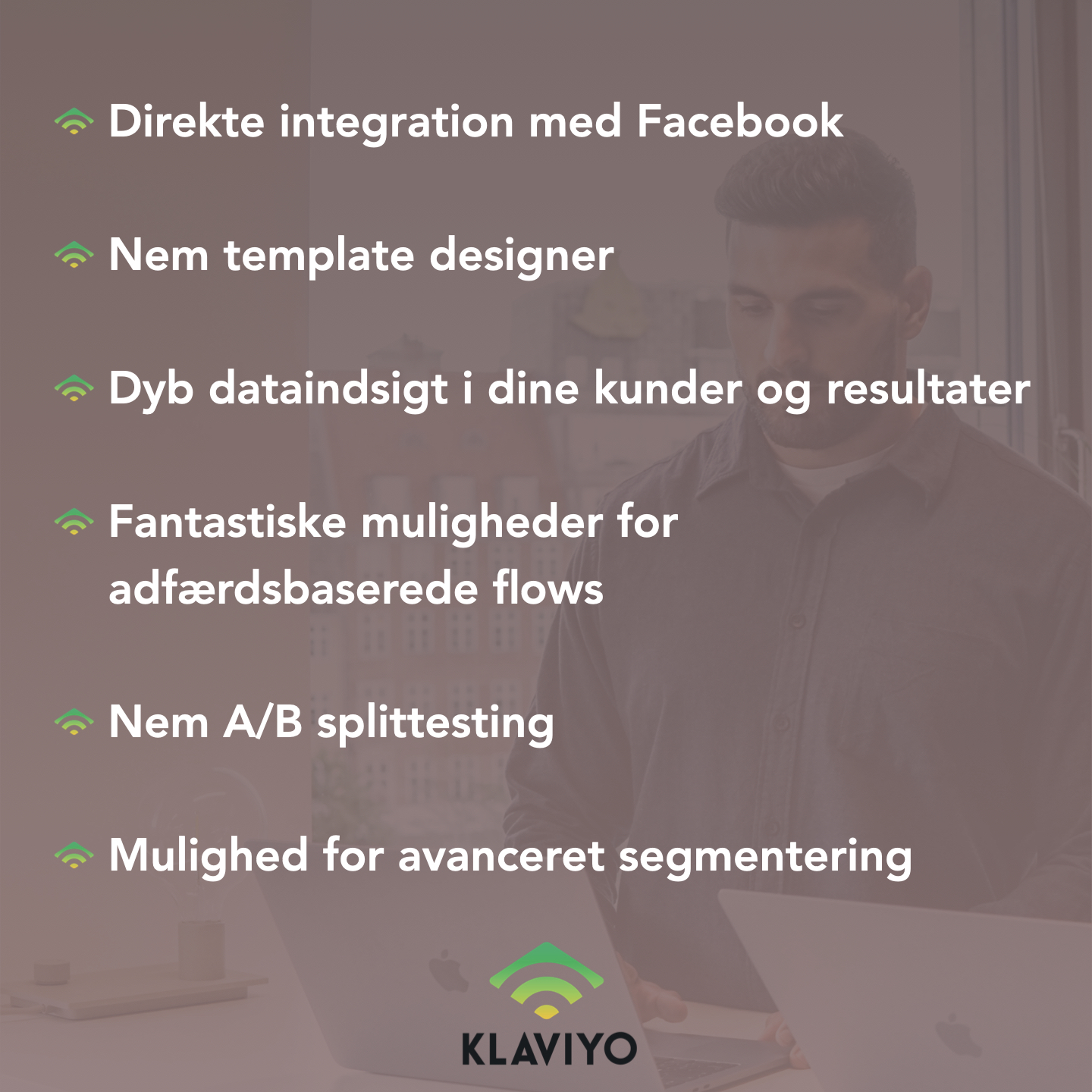 Mulighederne i Klaviyo er (rigtig) mange, derfor har vi lavet et udpluk af vores favorit features, som er illustreret på billedet. Udover de nævnte features giver Klaviyo dig et enkelt og dybdegående indblik i dine kunder. Det betyder bl.a. bedre kundeindsigt, mindre tid brugt på at organisere lister, og at du kun betaler én gang for hver profil, i stedet for at betale hver gang, de vises på en liste.